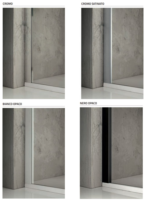 Porta Doccia: 1 anta fissa + 1 anta battente / fianco laterale: 1 fisso, vetro trasparente spessore di 6 mm.