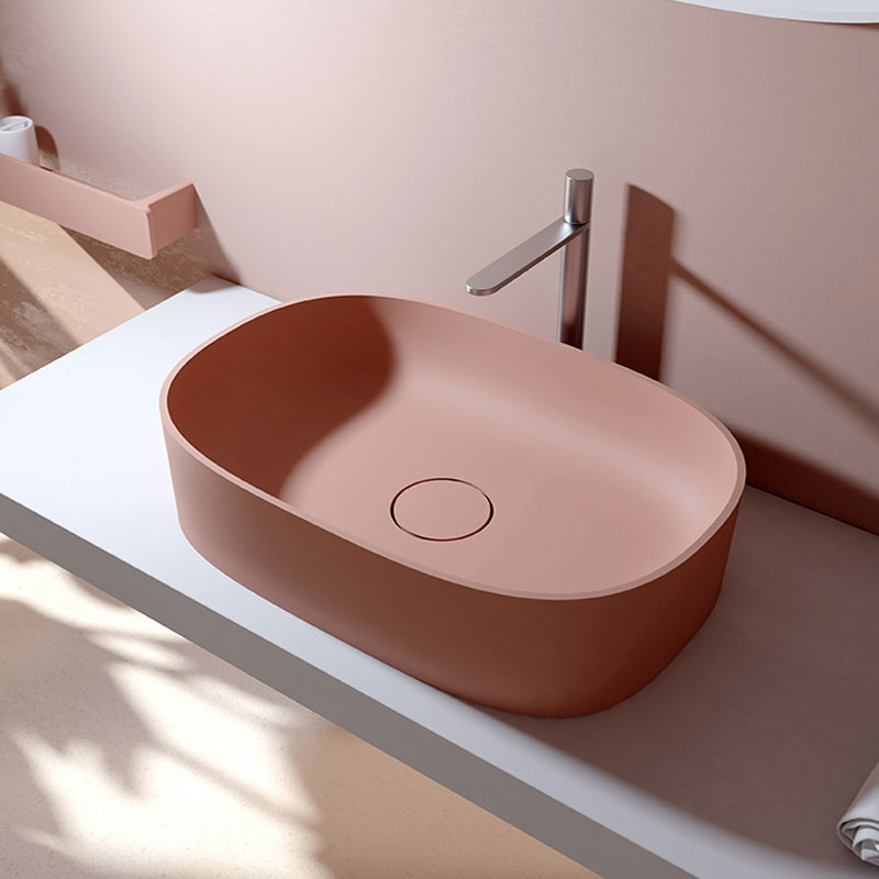 Lavabo con installazione da appoggio realizzato in Luxolid. Il lavabo viene fornito con piletta click clack in tinta.